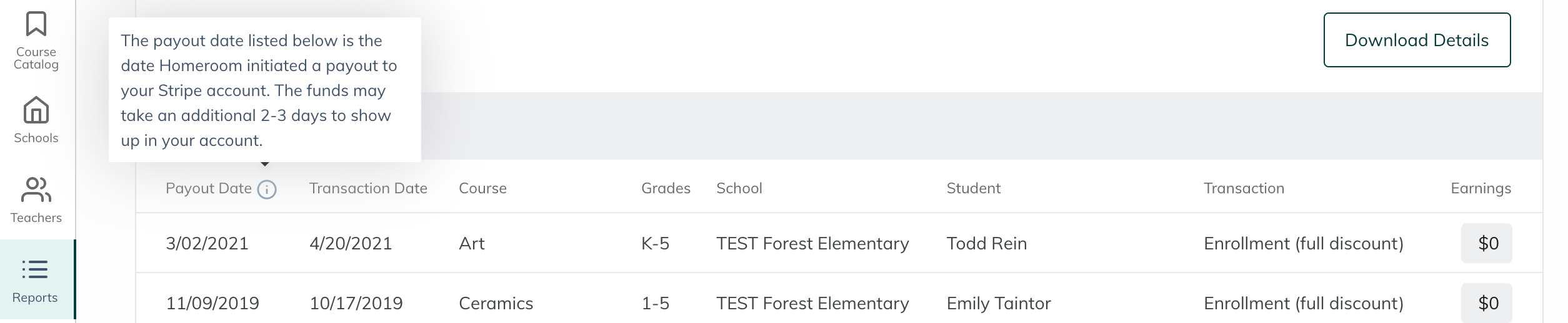 You can track enrollment transaction in your account once enrollment opens at your school. 24 hours after the enrollment period closes, all course fees minus the credit card processing fee will be transferred to your Stripe account. Stripe will display an estimated delivery date to your bank account or debit card within the Stripe dashboard. This may be 2-3 business days after the funds are in your Stripe account.